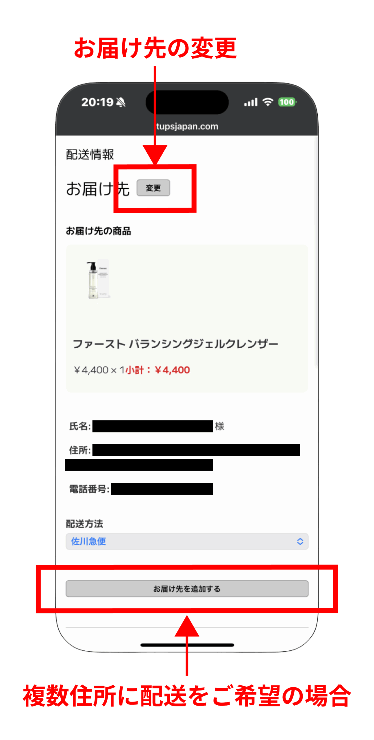 お届け先を変更したい場合は、お届け先の横にある「変更」ボタンよりお届け先の変更をしてください。